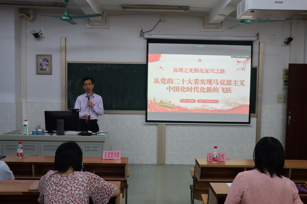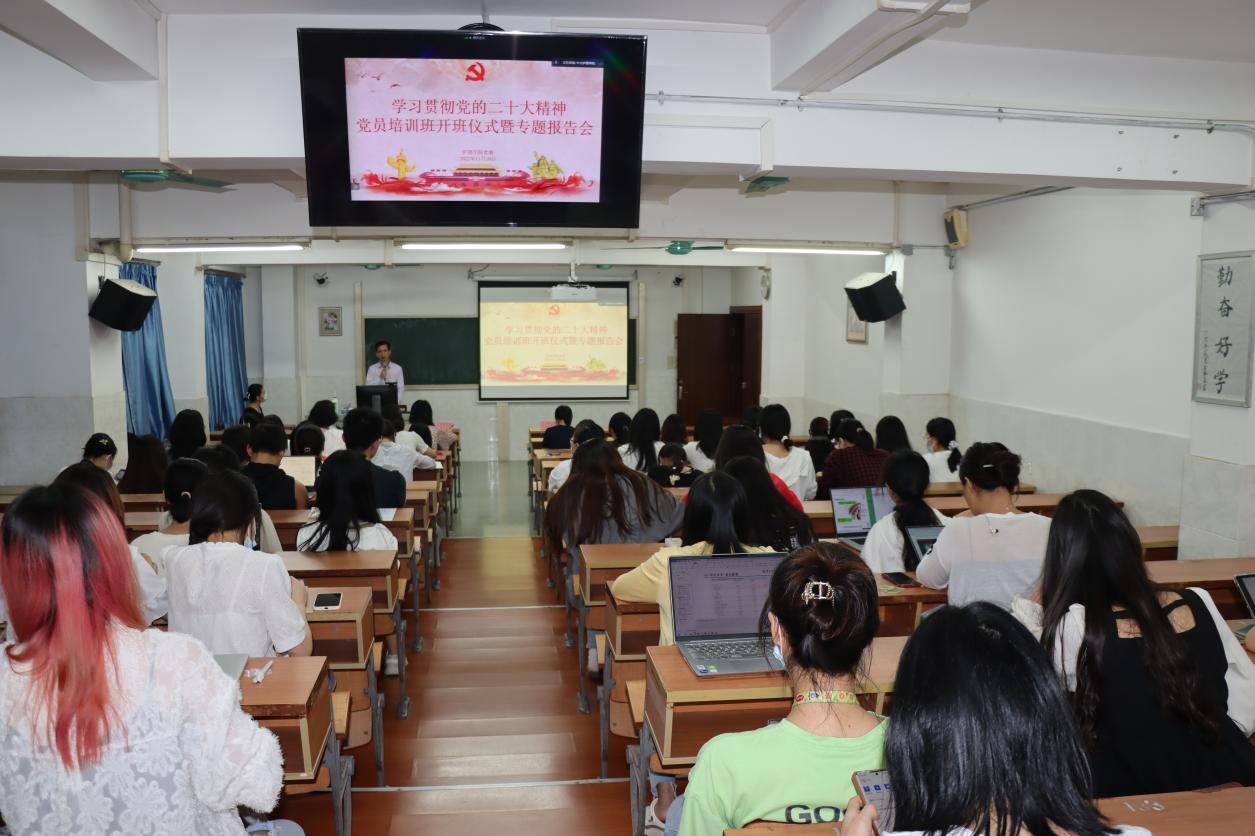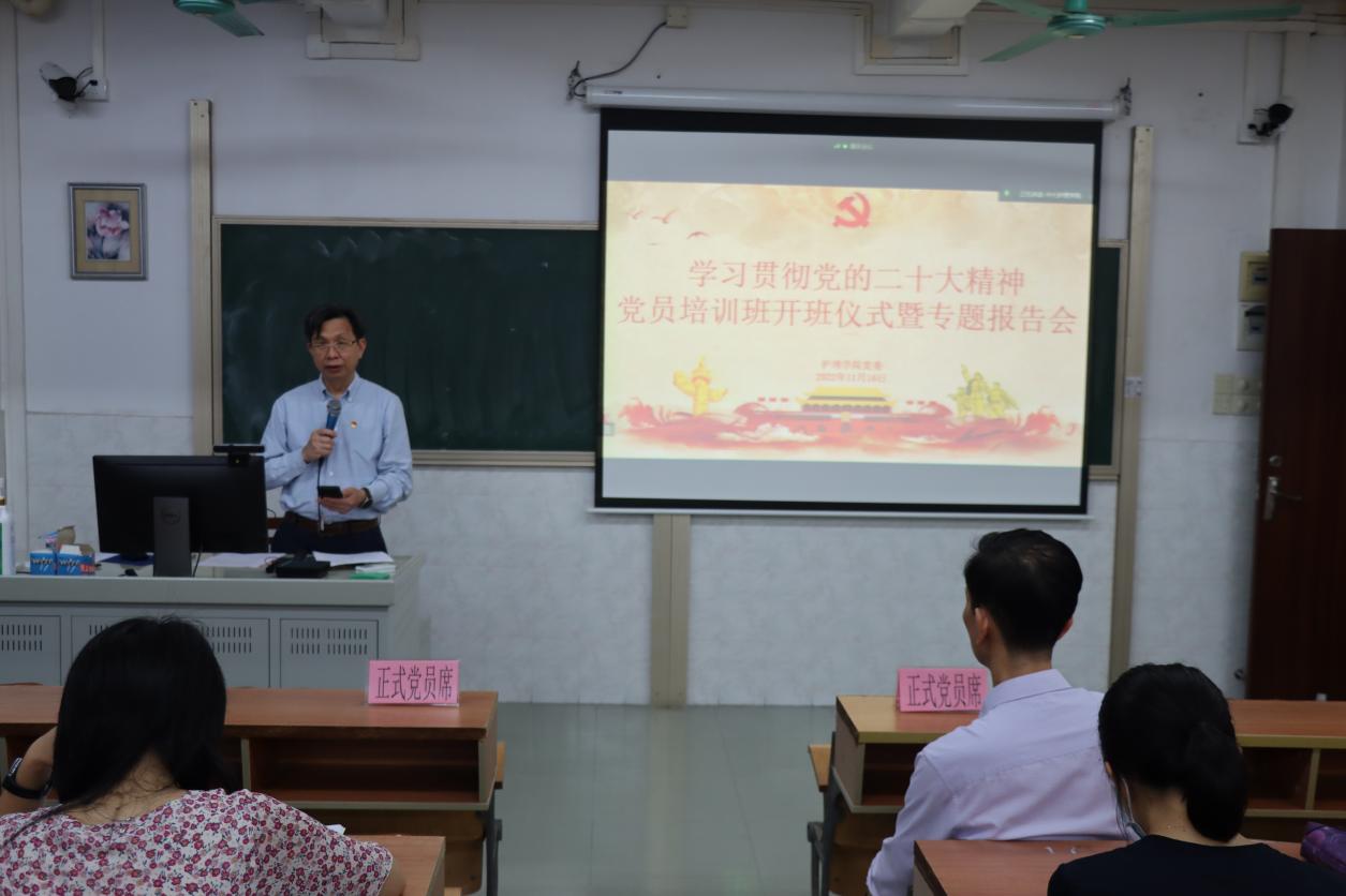 为认真落实党中央关于学习宣传贯彻党的二十大精神的决策部署和学校党委的工作要求,引导广大师生党员原原本本学习研读党的二十大报告和党章,认真领悟党的二十大提出的新思想新论断、作出的新部署新要求,11月16日晚上,av国产 党委在学院620课室以线上线下相结合的方式,举行学习贯彻党的二十大精神党员培训班开班仪式暨专题报告会。学院党委书记陈昌龄同志主持开班仪式并做了首场专题辅导报告。