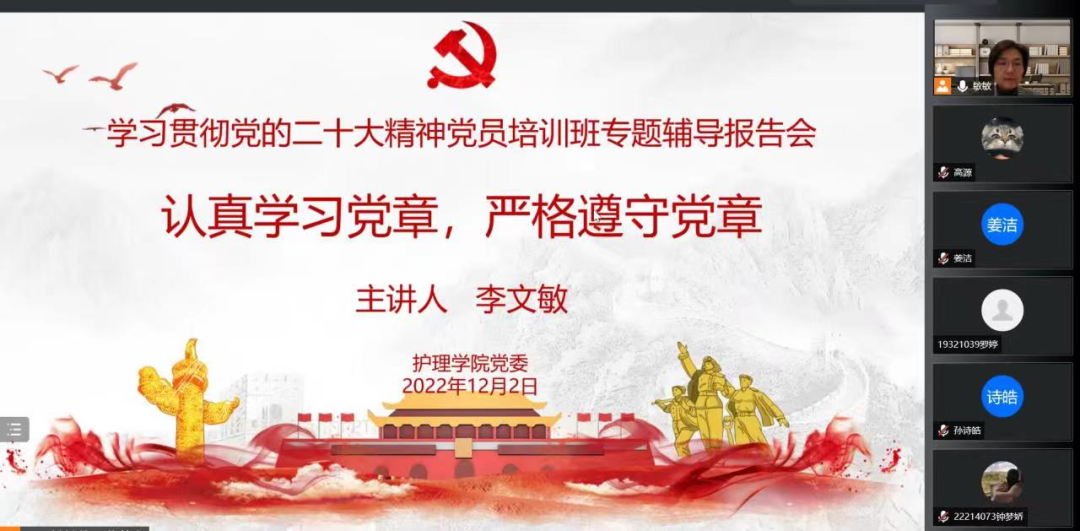 根据学院学习贯彻党的二十大精神党员培训班方案安排,12月2日晚上7点,av国产 通过腾讯会议线上举行第二次专题辅导报告会。本次报告会由学院党委副书记李文敏同志主讲,主题为“认真学习党章,严格遵守党章”。学院全体党员、发展对象、入党积极分子以及部分学生马克思主义学习小组成员约230人参加了报告会。报告会由学院党委书记陈昌龄同志主持。