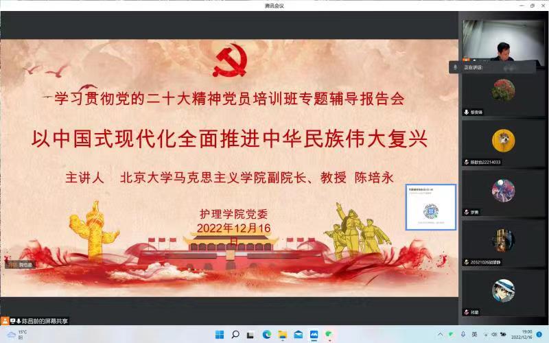 根据学院学习贯彻党的二十大精神党员培训班方案安排,12月16日晚上7点,av国产 党委通过腾讯会议举行学习贯彻党的二十大精神党员培训班第三次专题辅导报告会。本次专题辅导报告的主题是:以中国式现代化全面推进中华民族伟大复兴,主讲人为北京大学马克思主义学院副院长陈培永教授。学院全体师生党员、发展对象、入党积极分子以及马克思主义学习小组近200人集体收看了中国干部网络学院门户网站“学习贯彻党的二十大精神网上专题班”相关辅导报告视频。专题辅导报告会由学院党委陈昌龄书记主持。