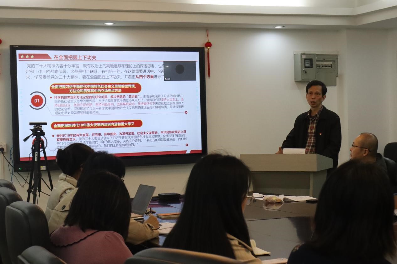 接着,陈昌龄书记为全体学员做了题为“全面学习、全面把握、全面落实党的二十大精神”的专题辅导报告。陈昌龄同志以习近平总书记在二十届中央政治局第一次集体学习的重要讲话精神为根本遵循,详细阐述了学习贯彻党的二十大精神如何落实“在全面学习上下功夫”、“在全面把握上下功夫”、“在全面落实上下功夫”。他指出,我们要进一步把思想和行动统一到党的二十大精神上来,坚定不移把党的二十大提出的目标任务落到实处,以奋发有为的精神状态,努力推动学院党建高质量发展。